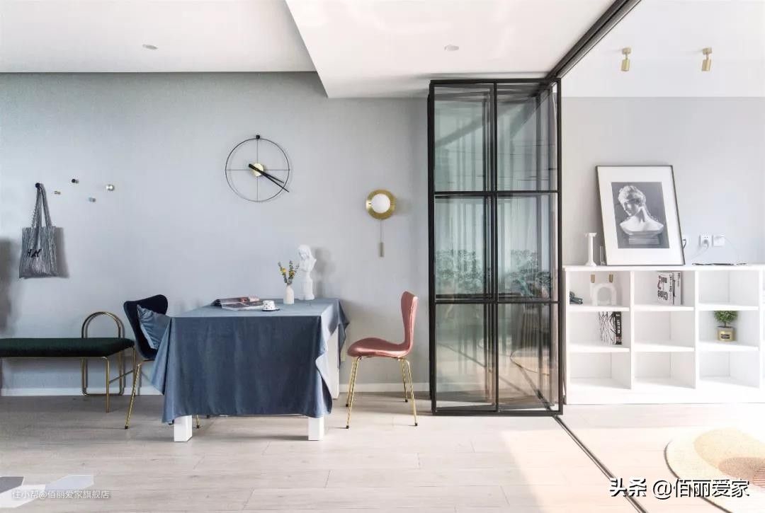 餐桌主要用来就餐,使用的频率不会很高,折叠的餐桌很好地节省了小户型的空间。餐厅后方与客厅之间做了黑框玻璃折叠门,让客厅成为一个独立安静的休闲区。