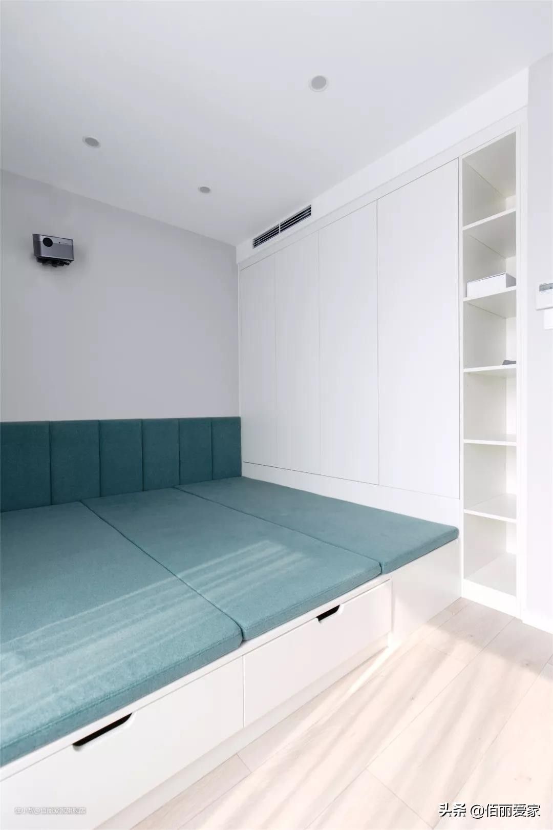 卧室设计榻榻米,并将飘窗一体化定制,榻榻米和飘窗底部藏着很大的收纳空间,可以收纳过季的衣物,铺上床垫就是一张完整的大床。