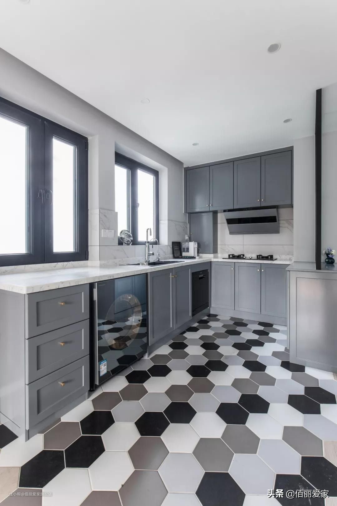 鞋柜背后的厨房,靠窗定制L型的银灰色橱柜搭配白色瓷砖,采光好、操作台面较宽敞。