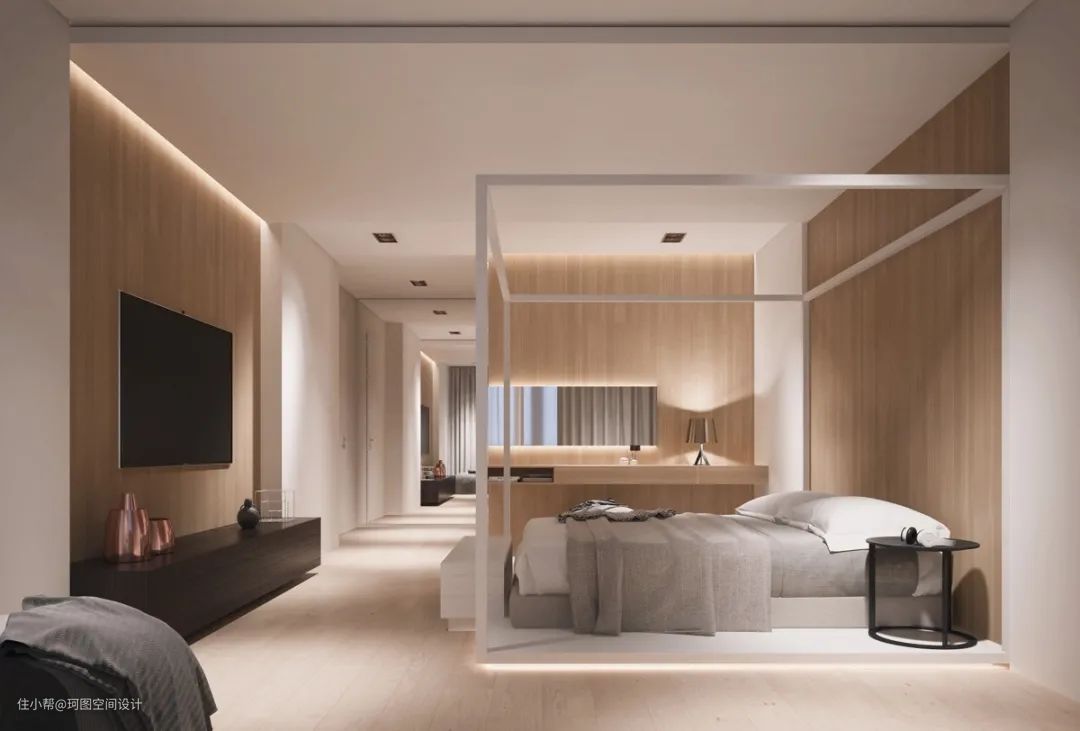 - 这间简约的卧室有四帷柱大床和大型平板电视,舒适而别致。四帷柱大床是另一个提高房间奢华氛围的好选择。它们比平台床更经典,而且有很多现代设计。