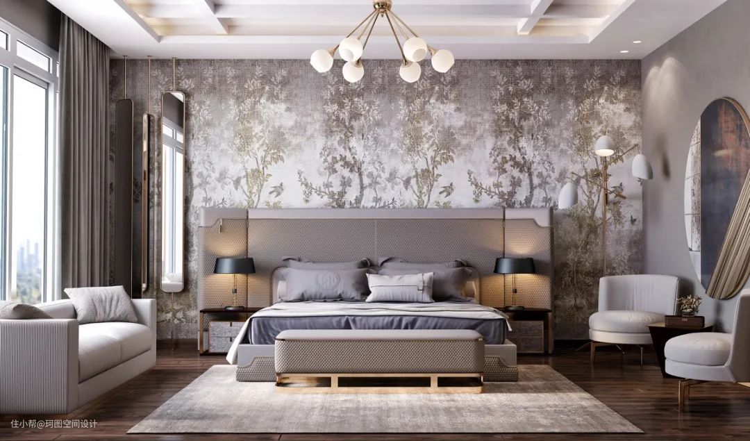 - 整个设计中的多种纹理是一种视觉享受。特别是那块独一无二的镜面背板,让人觉得相当大胆。在设计豪华卧室时,拥有独一无二的作品是非常好的,因为当你的空间有完全独特的东西,可以使整个设计感觉更放纵。