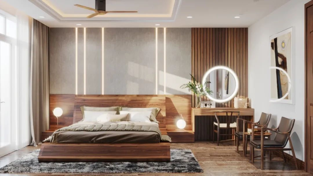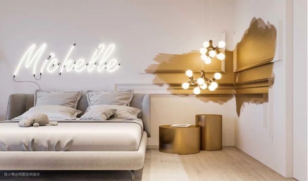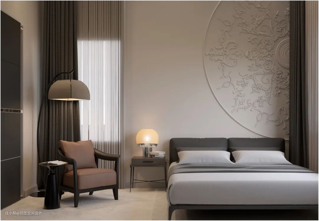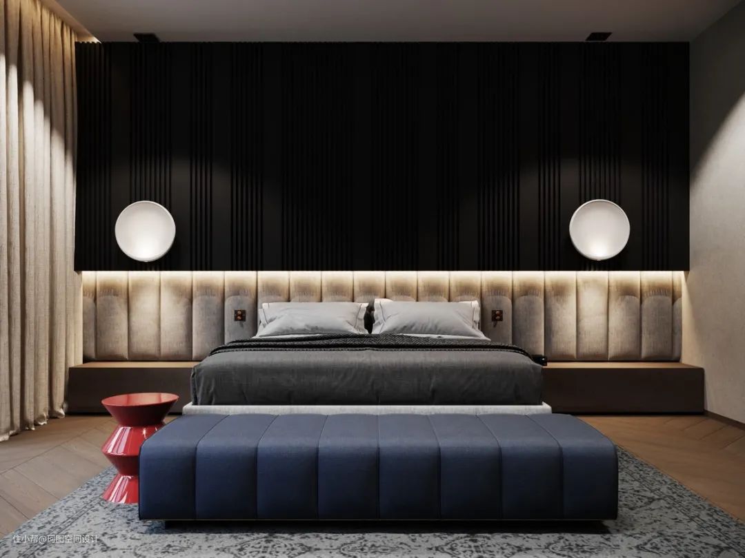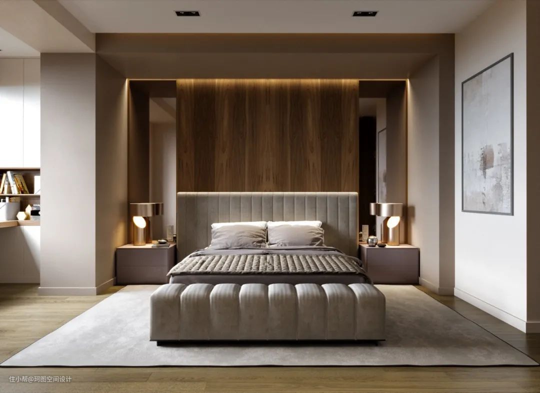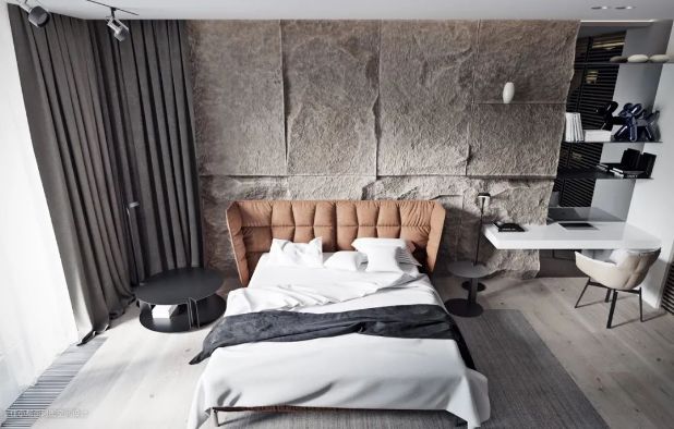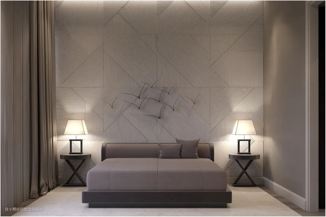 - 通过使用卧室重点墙和墙面雕塑搭配,一个简单的卧室就被改变了。在卧室里使用有纹理的床头墙,可以在房间里创造更多的视觉亮点和维度,又可以让房间感觉更豪华。