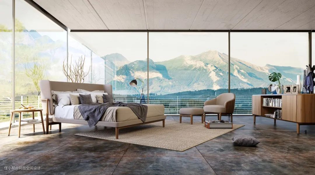 - 这间工业化的卧室通过使用极简主义的家具和大量的混凝土,将空间带入一个不同的方向。尽管这个设计与其他设计大相径庭,但它结合了内置照明和低平台床,使得床头墙面很有个性。