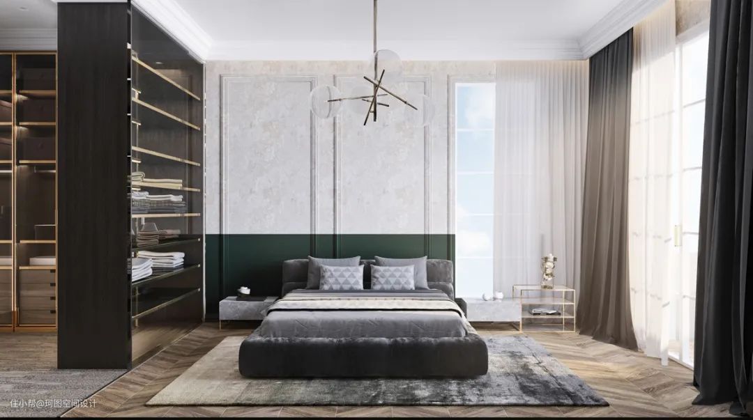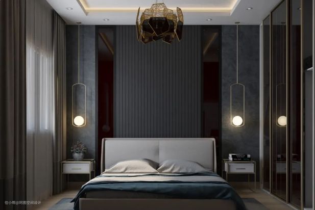 - 在这个空间里,诱人的黑暗色调通过卧室吊灯得到了完美的照明。上面的高贵的金色,以及独特的吊灯和床头柜,让这个卧室感觉适合现代皇室。