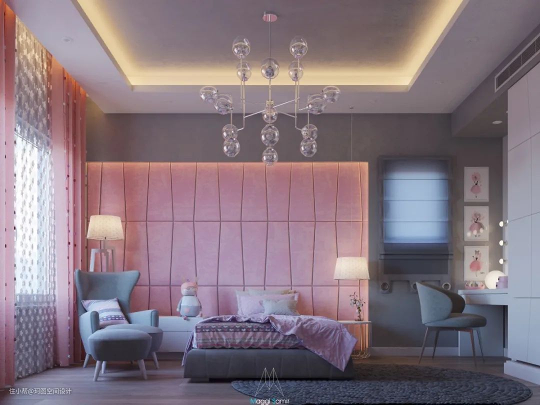 - 这间豪华的儿童卧室充满了温暖的气息。柔和的粉色与较深的灰色搭配,形成了恰到好处的对比。特别喜欢这面超大的毛绒墙。