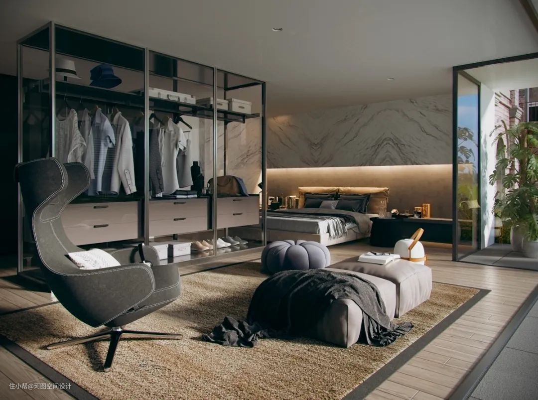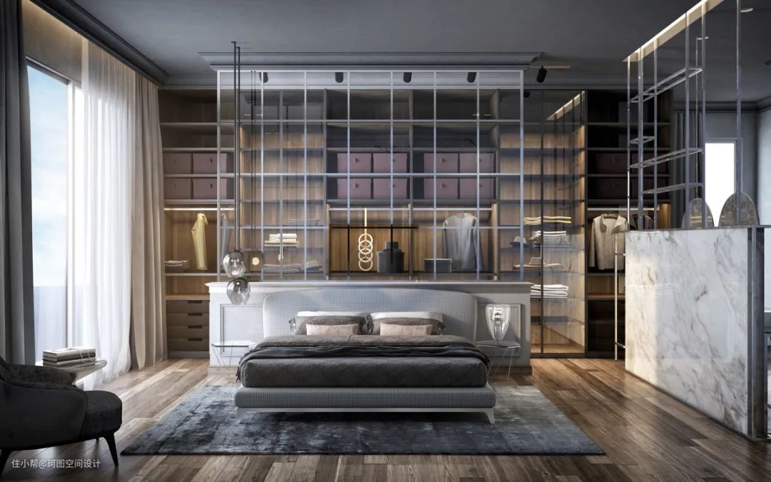 - 这完全不是我们平常所想到的带步入式衣柜的卧室。这间卧室通过使用玻璃和大理石的隔断让空间保持开放式。两种建筑材料都可以帮你实现一个更加迷人的卧室。