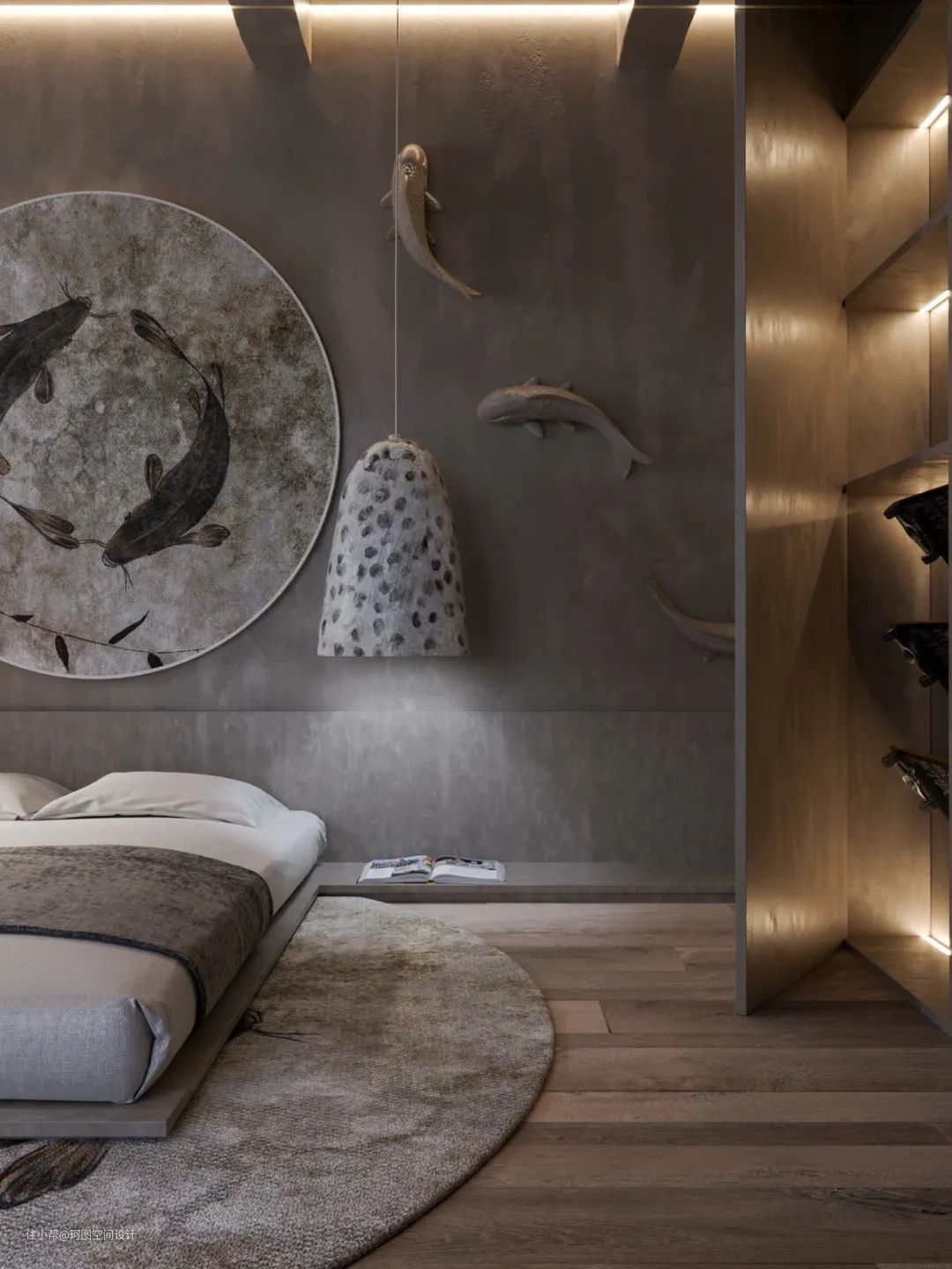 - 这间亚洲风格的卧室没有太多的色彩,但它确实有很多的特色,以锦鲤为主题。我们可以看到墙面和地板上都使用了这个主题。3D墙面艺术真的给这个房间带来了一些额外的维度。