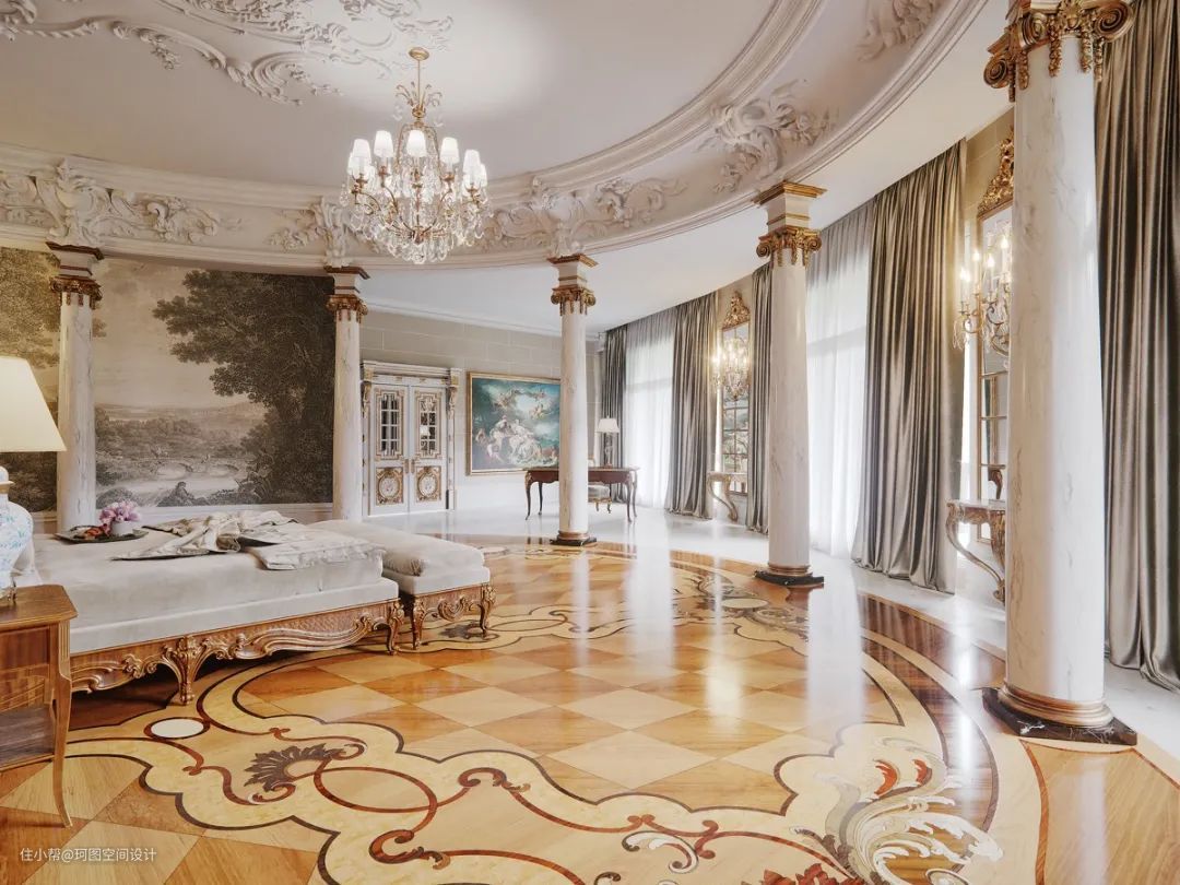 - 这个格局就更大了,实现了很多人曾想过成为皇室成员的感觉。复杂的设计、拱形的天花板和大理石柱,这间卧室有很多值得羡慕的地方。如果想搬到自己的家中,你可以在卧室中加入壁画,或者尝试采用金色和白色大理石的配色方案,来得到这样的外观。