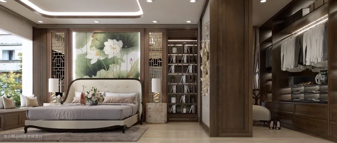 - 这个开放式的设计对步入式衣柜进行了重新构想。通过把床推到房间的中间,这样就可以建起一堵部分墙。这面墙不仅起到了床头板的作用,而且还有助于将衣柜与房间的其他部分分开,而不至于完全封闭。