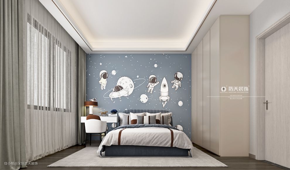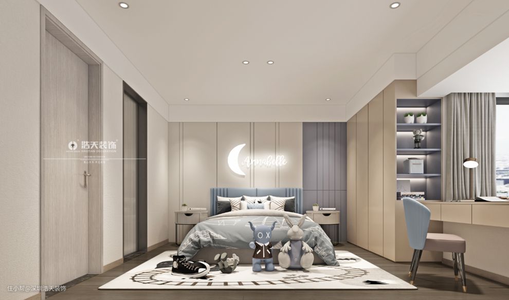 小孩房的设计在硬装上都相对成熟,随着年纪的增长也不会过时。加入蓝色的点缀,保留着孩童的喜好。