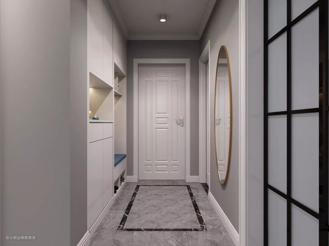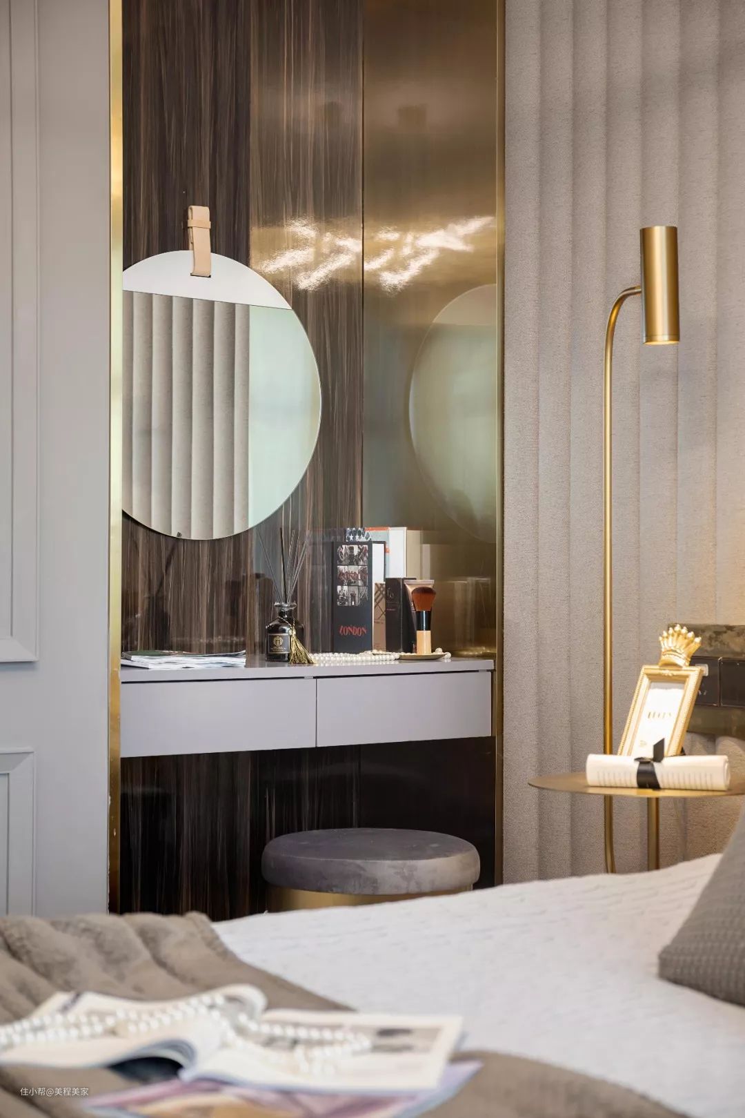 能让空间看起来清新明亮的的颜色很多都是浅色系,比如清新淡雅的水绿色、水蓝色,特别是家里光线较为不足的情况下,这种浅色系列都能起到一种提亮、以及拓展空间视觉的效果。而金色边的镜子、灯饰等等物件,硬朗的风格点缀着这个柔和的小空间,带来时尚、夺目风风采。
