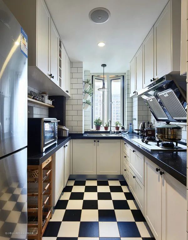在U型布局的厨房中,洗涤区、烹饪区和操作区划分明确,空间利用率极高,无需过多的走动,就能轻松的做出一顿饭来。