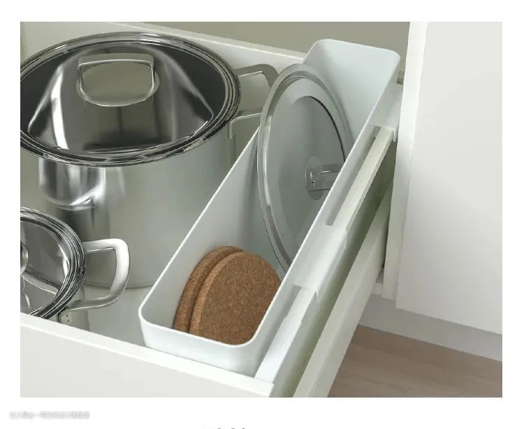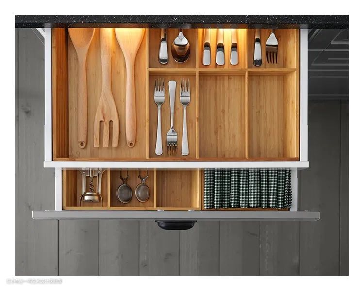 2、抽屉柜内部要细分。底柜抽屉高度可分为三层:浅尺寸、常规尺寸以及深尺寸。这样设计,滑轨抽屉的首层很好地容纳碗筷刀叉这样的小物件,下面放其他碟盆,拿取省力又安全。