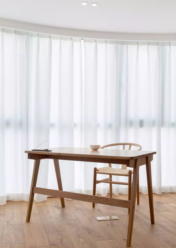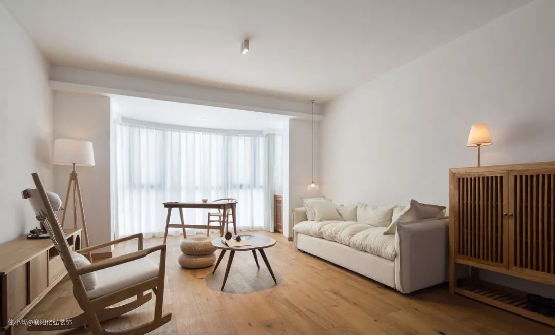 muji风格的地板主要是采用白、浅咖色、原木色、米黄等温和低调色系。白色的窗帘透光好,又保证了客厅的私密性。