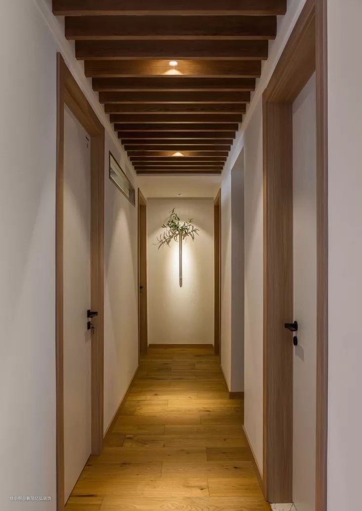 过道走廊的吊顶做了特殊处理,像是栅栏一样的设计,中间设计了点射灯,暖暖地照下来,很温暖。