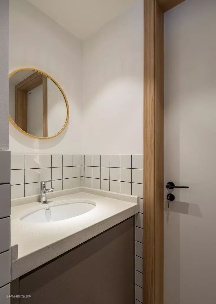卫生间的金边圆形镜子很有质感,采用半墙的小方砖。