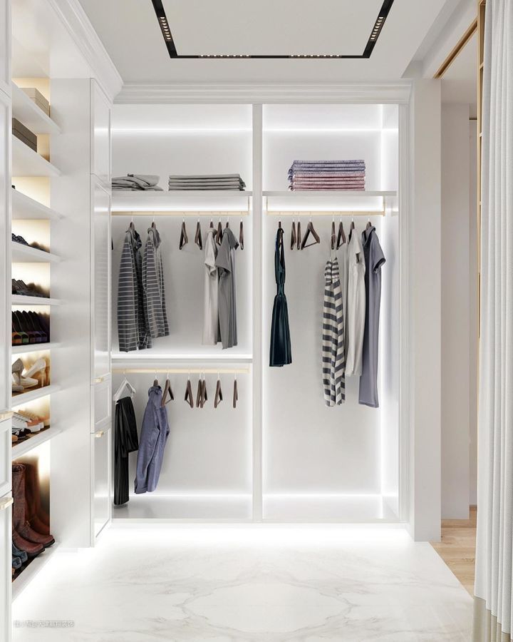 步入式衣帽间的灯光,以主灯+辅灯的方式进行,除去一盏主要的照明灯外,在各分区的隔层都可增加灯带、筒灯等隐藏式设计。