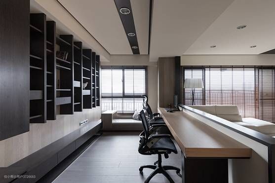 书桌与书柜是书房的标配,书桌靠沙发,那么可以利用一面墙打造书柜,以满足书籍与收藏品的收纳与展示功能。