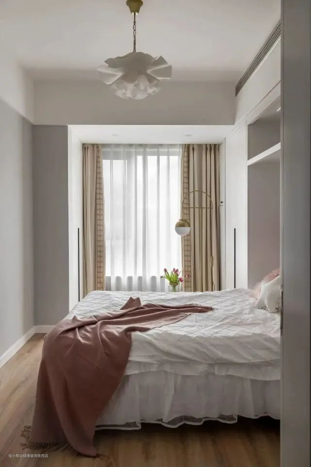 主卧是以粉色为主的卧室,搭配富有温度的家居陈设,营造出浪漫轻松的氛围。黑白几何形状的镂空窗帘带来一种隐约的美感,这种似有似无的艺术境界,为空间打造出独特的设计韵味。金色的点缀,粉色与白色的衔接,让主卧更加温馨浪漫,让空间更加协调。小阳台的位置,被打造成了一方梳妆的空间,通透充足的自然光线,让女屋主在对镜自照的时候,也能拥有一番好心情。