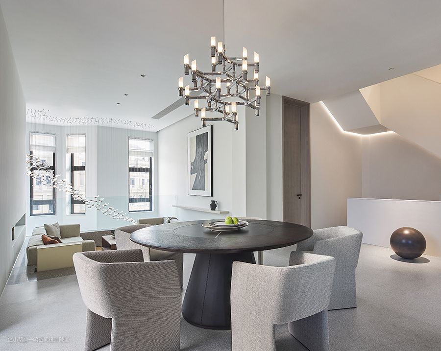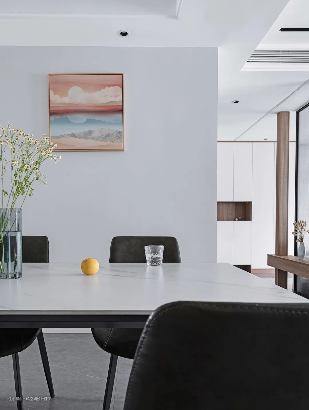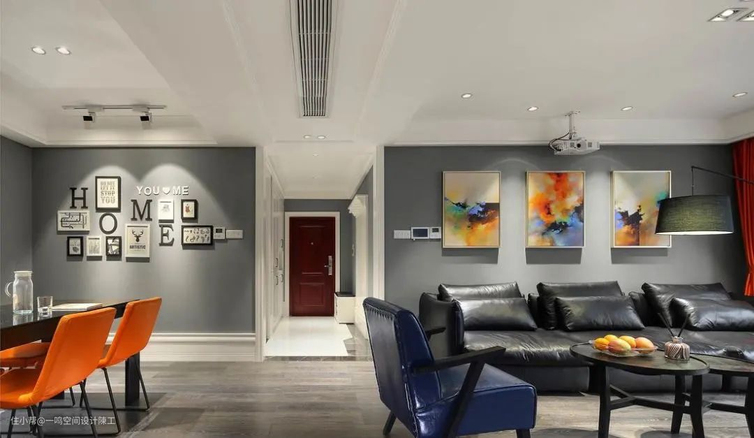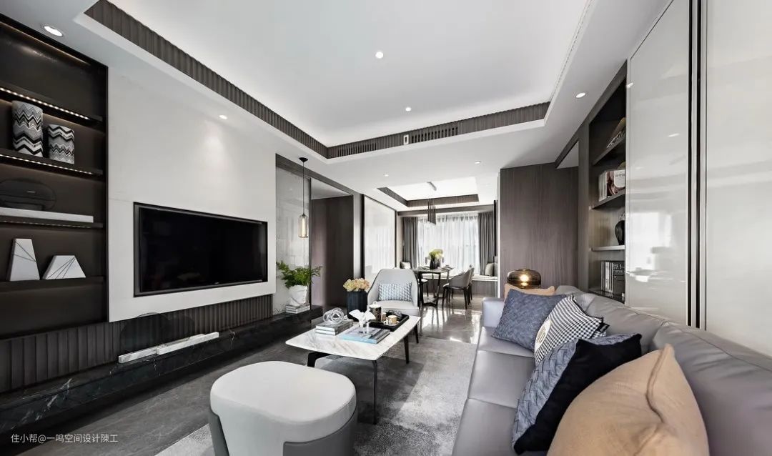 中央空调一般是下回风,安装在沙发上方,出风口对着电视墙一侧吹,会给人比较舒服又无风的清凉感。