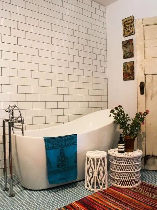 浴室更是不走寻常路,地毯,柳条桌,有趣的图案,艺术品和鲜花都为新波西米亚风增添了一丝心意。