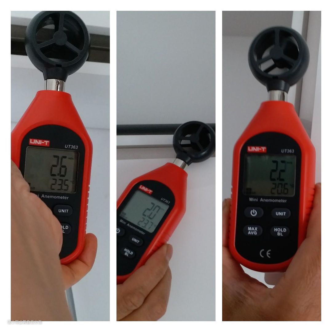 ▲用风速表看一看,在水平方向,风速高达4.2米/秒,稍微往下一点,风速就只剩1.3米米/秒,而再往下一些,就彻底没有风了,所以即使把这款空调放在办公桌正上方,也无需担心被冷风吹到感冒了。