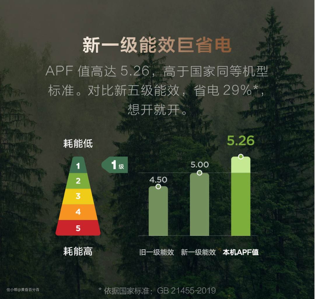 ▲正因如此,其APF值达到了5.26,达到并远远超过了国家新一级能效的标准。可以说是非常的省电了,整夜开着空调也不用担心费电了,我妈妈那一辈人平时都特别的节俭,相信很多朋友都有类似的感觉, 这次可以用这个一级能效的标识让她们放心的使用了。