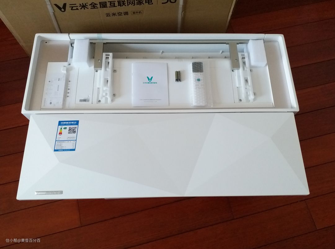 ▲拆开外包装,发现云米内机的设计非常新颖,内机上盖可以轻易拆卸,遥控器,说明书等均收纳在其中。