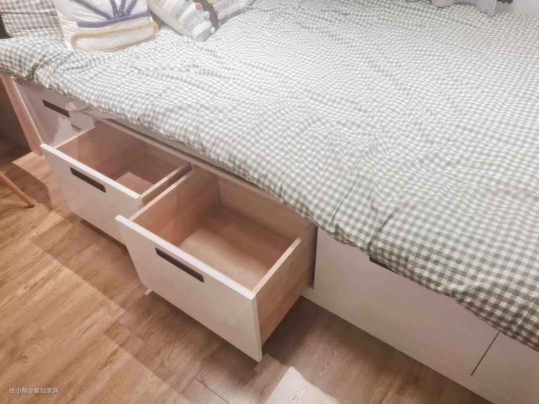 抽屉式的高箱床使用就很简单了,不过要记得抽屉开合需要一定的空间,所以在规划床位时需要多留个心。