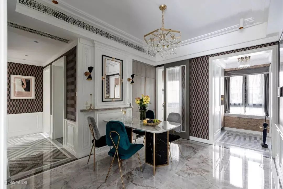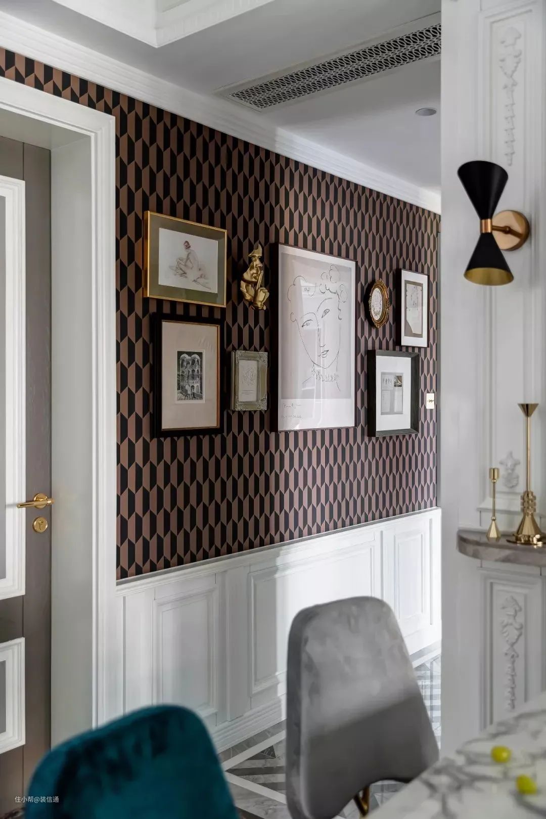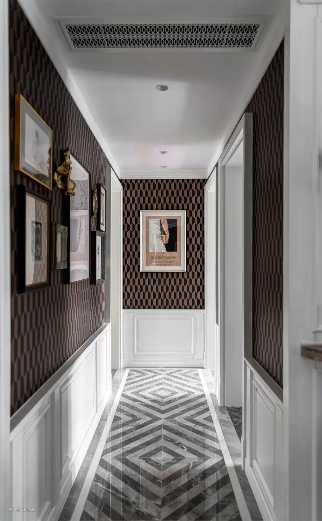 过道延续了餐厅的几何系列壁纸,地面拼花迎合了门厅的拼贴,运用双色菱形的延伸,让空间扩容。