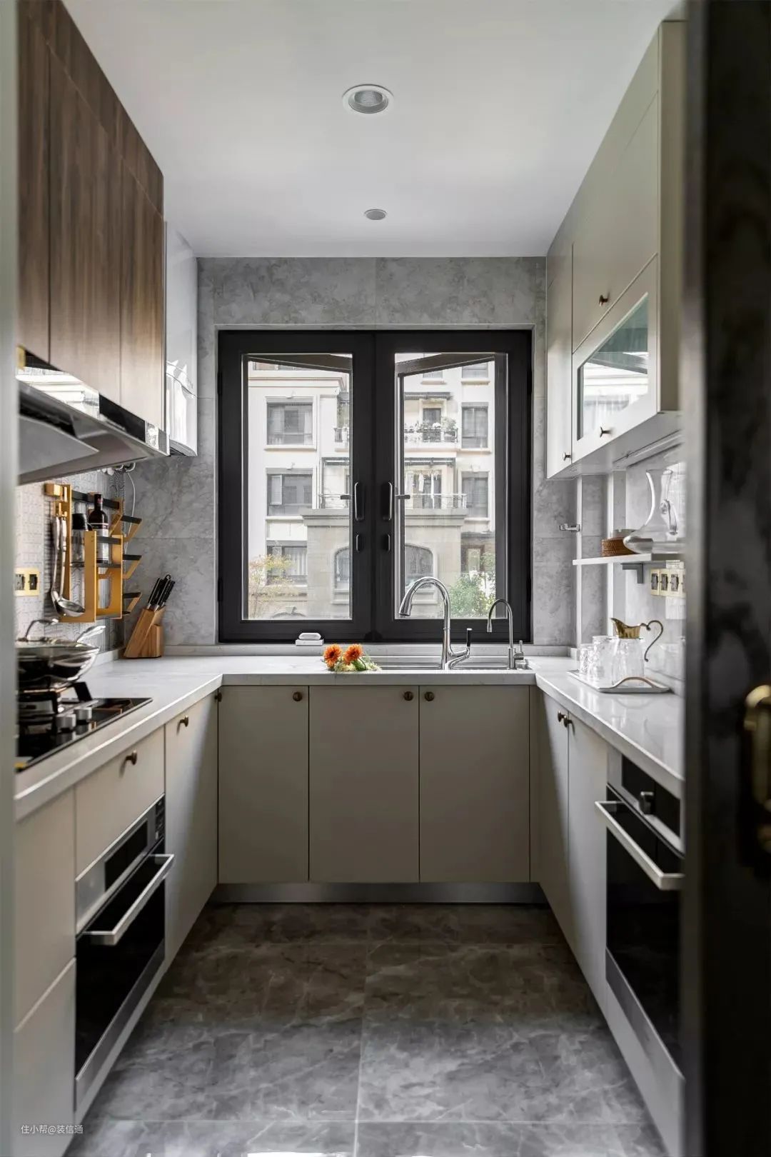 灶台的背景砖选了四色混拼花纹长条砖,厨房内的五金挂件都是黑金色,所有软装的选择都透露着精致的小心思。