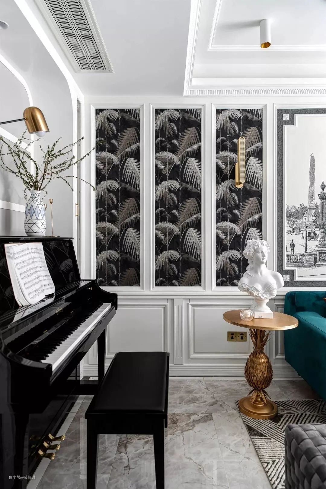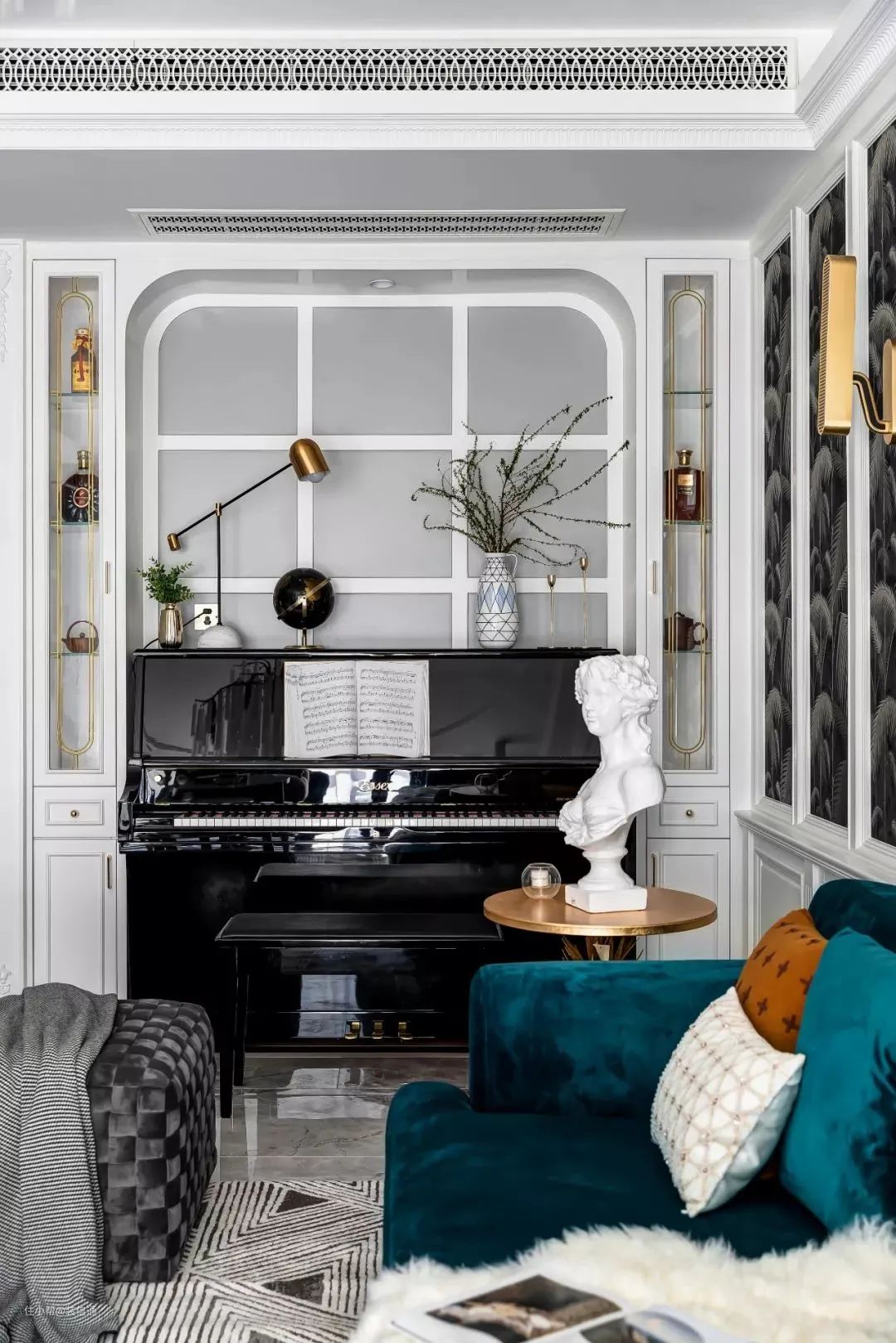 客厅一侧便于小孩平日练琴,中间是弧形九宫格的灰白分格,两侧是艺术玻璃展示酒柜,厚度与钢琴几乎齐平,让钢琴区很好的融合到整个客餐厅空间中。