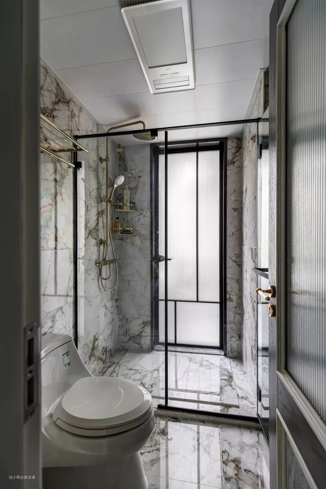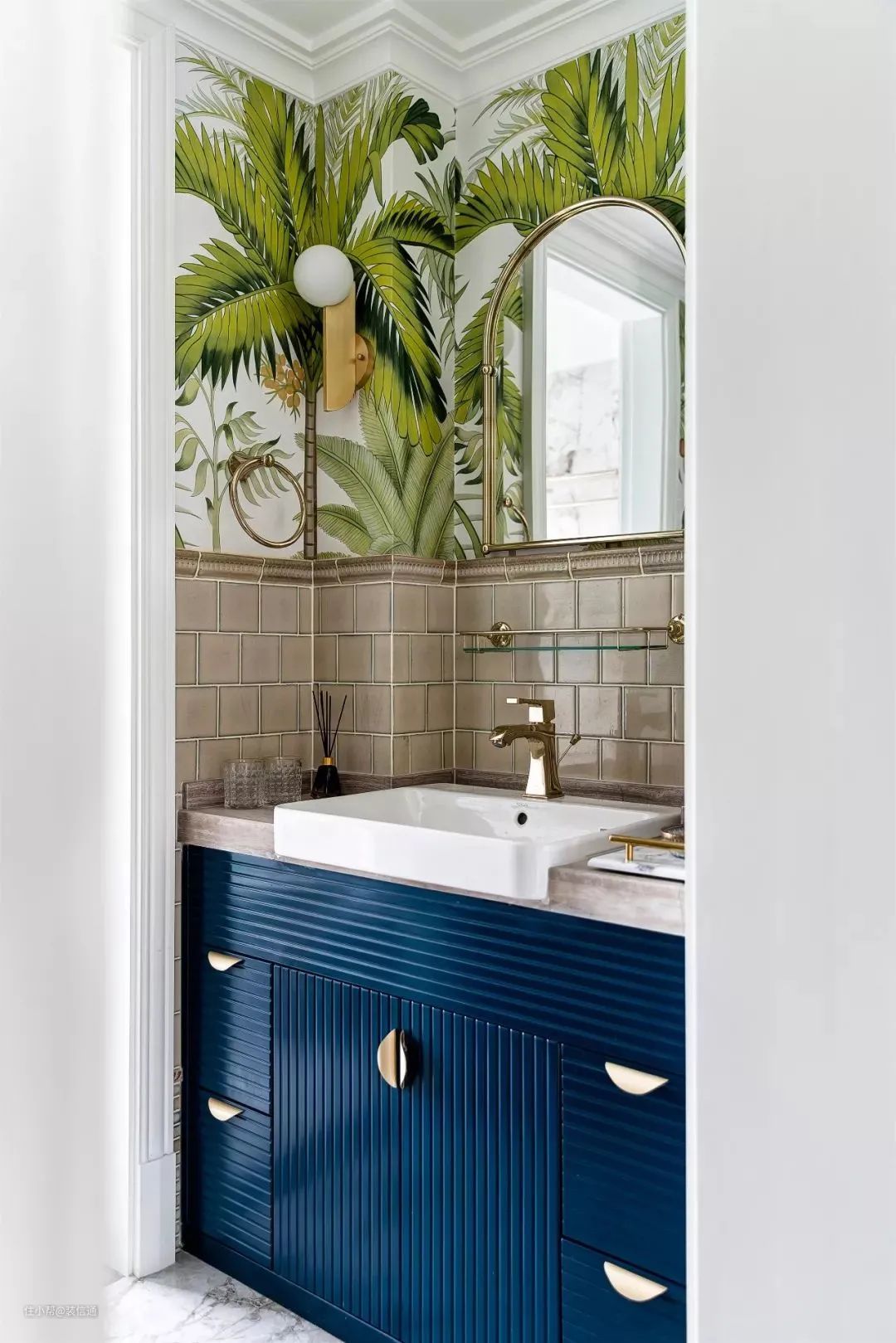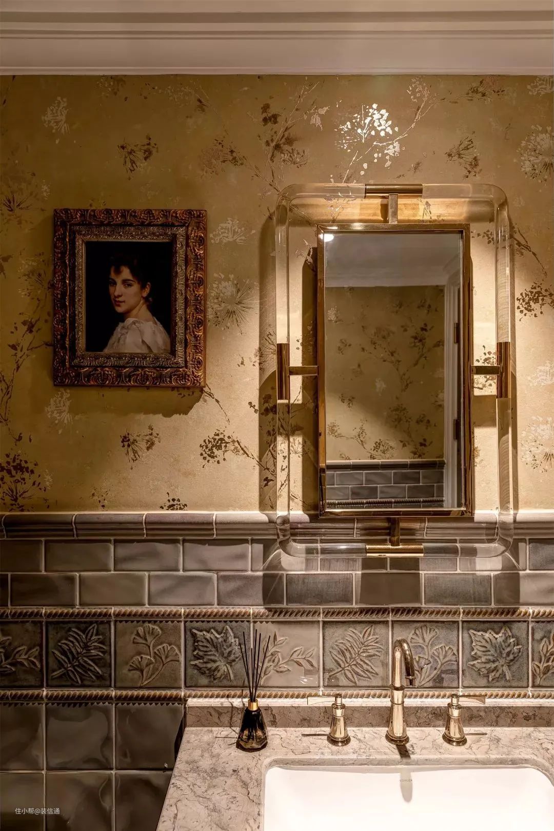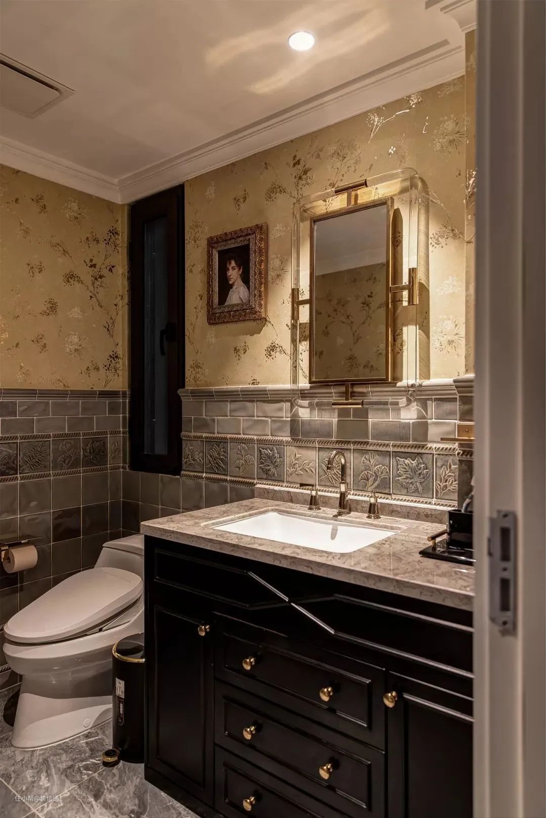 走进主卫,地面深灰系的地砖,墙面半墙仿古拼花砖,香槟色系花纹墙纸,主卫的精致感,也太过惊艳。