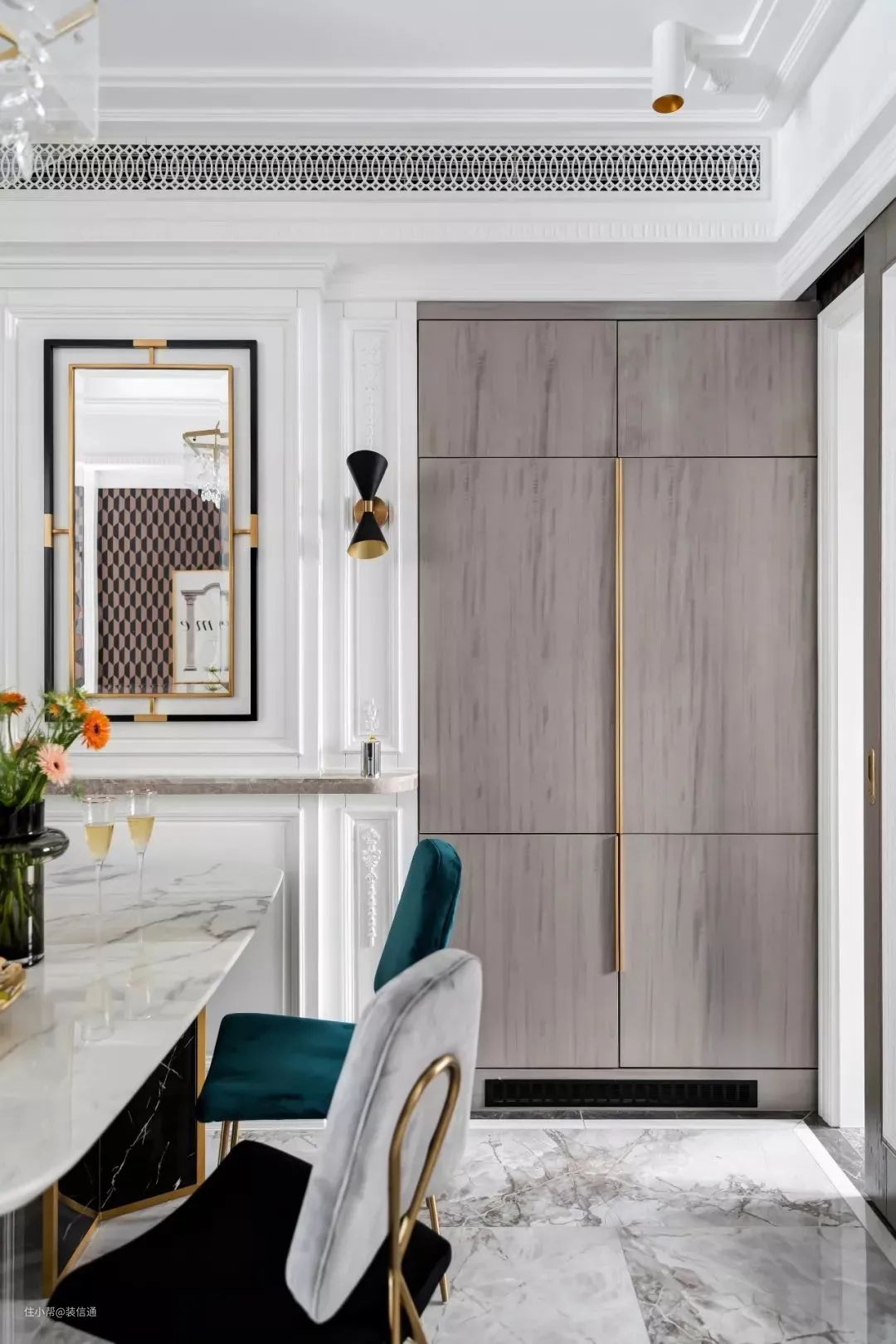 冰箱放置在了餐厅且作了隐形处理,与墙面护墙完美融合,与入户鞋柜柜门使用了同样的影木材质,搭配香槟金色长把手,风格统一,简约精致。