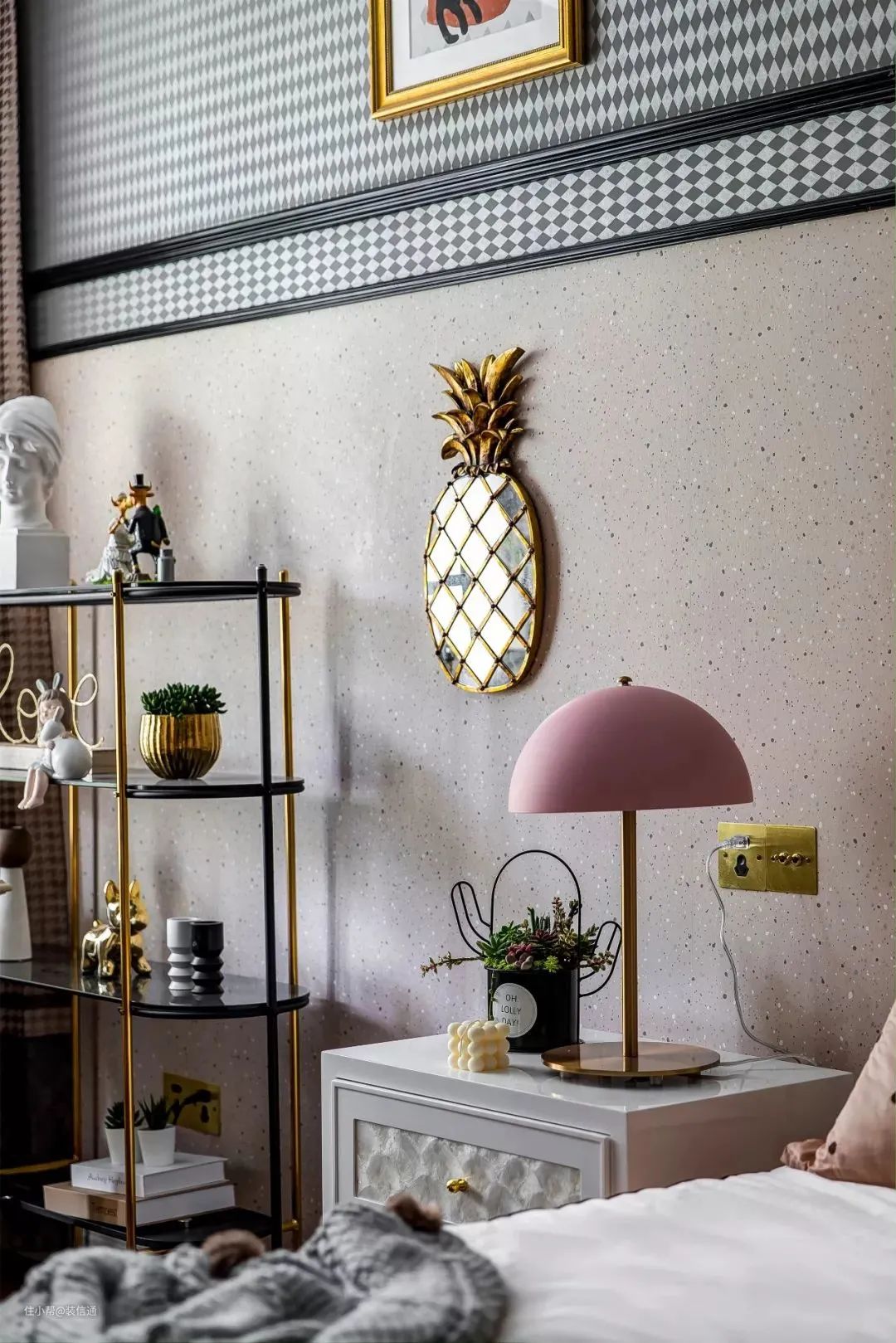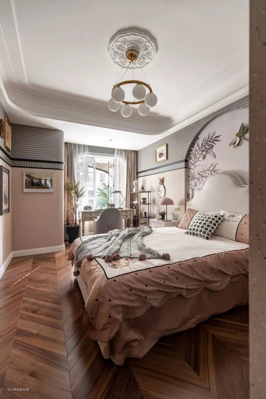 女儿房床头背景墙圆拱造型很吸睛,配珍珠白皮质铆钉床头嵌入其中,给予更好的包裹感和安全感,背景一幅花鸟壁画,立体的蜻蜓镜饰壁挂其中,仿佛有种画中飞出的感觉。