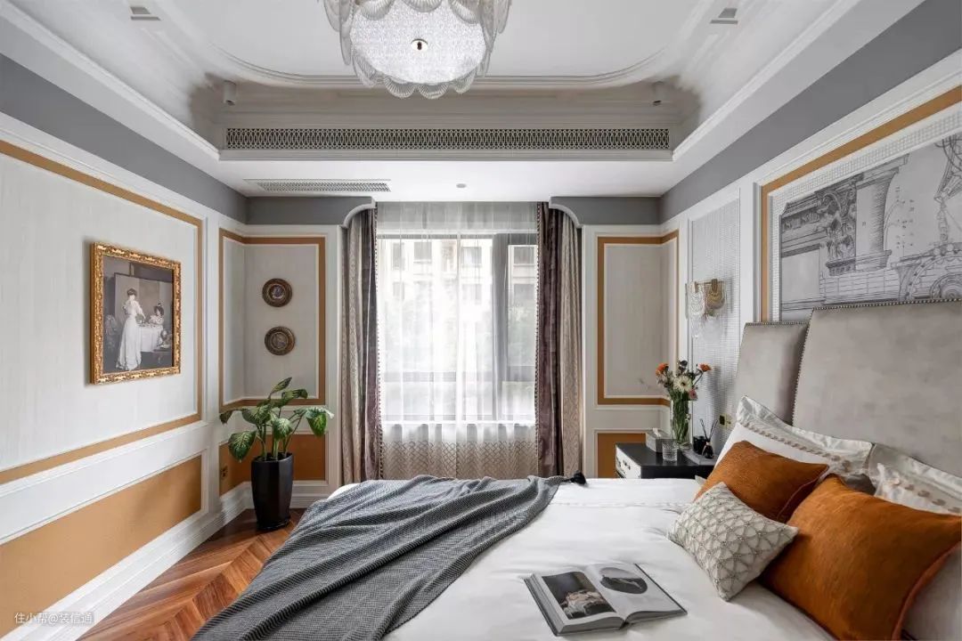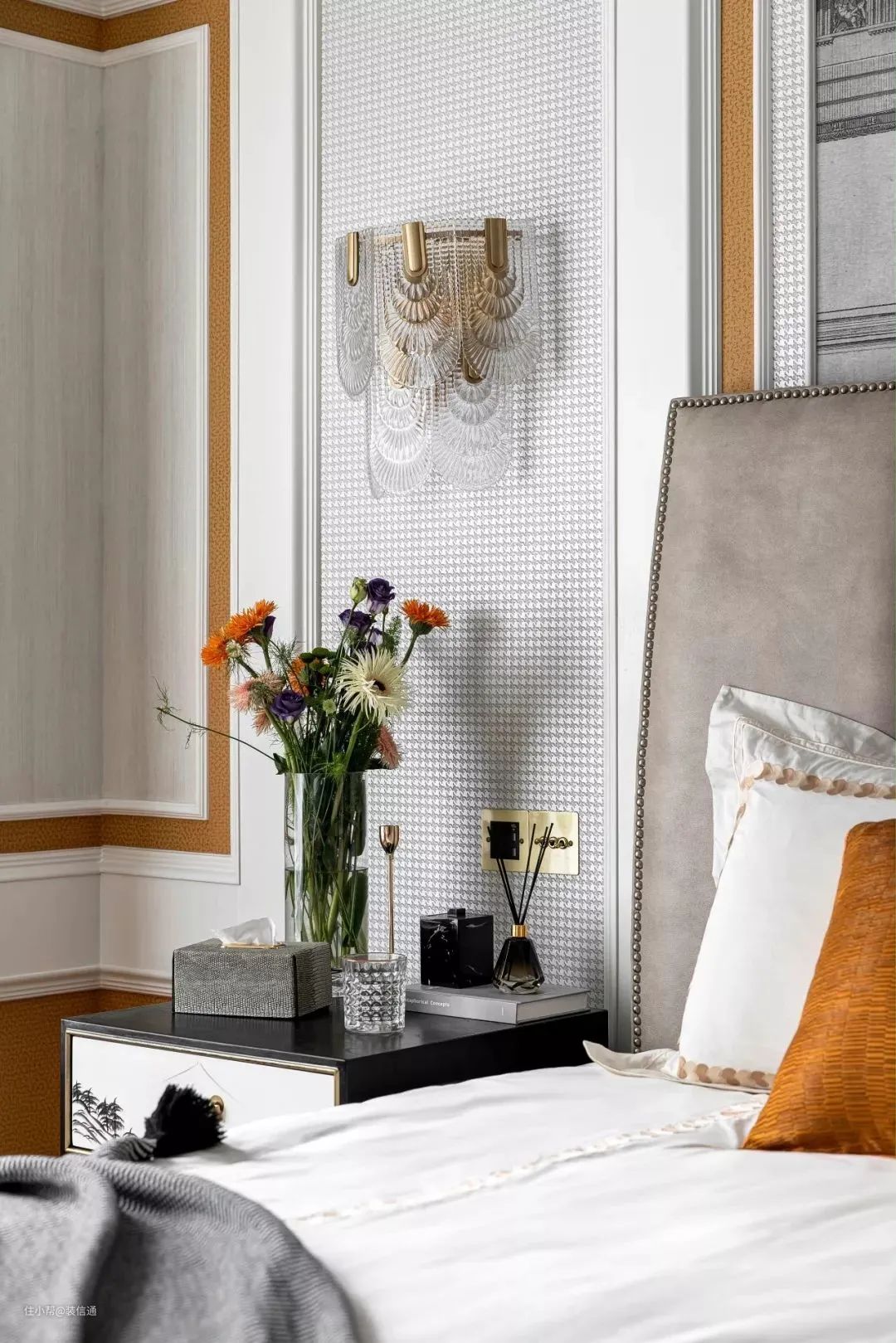 对比公主风的女儿卧室,主卧更显优雅气质,以浅灰奶白为主色调,局部点缀橙色,褐色,深灰,层次穿插搭配,不过分繁复,尽显精致。