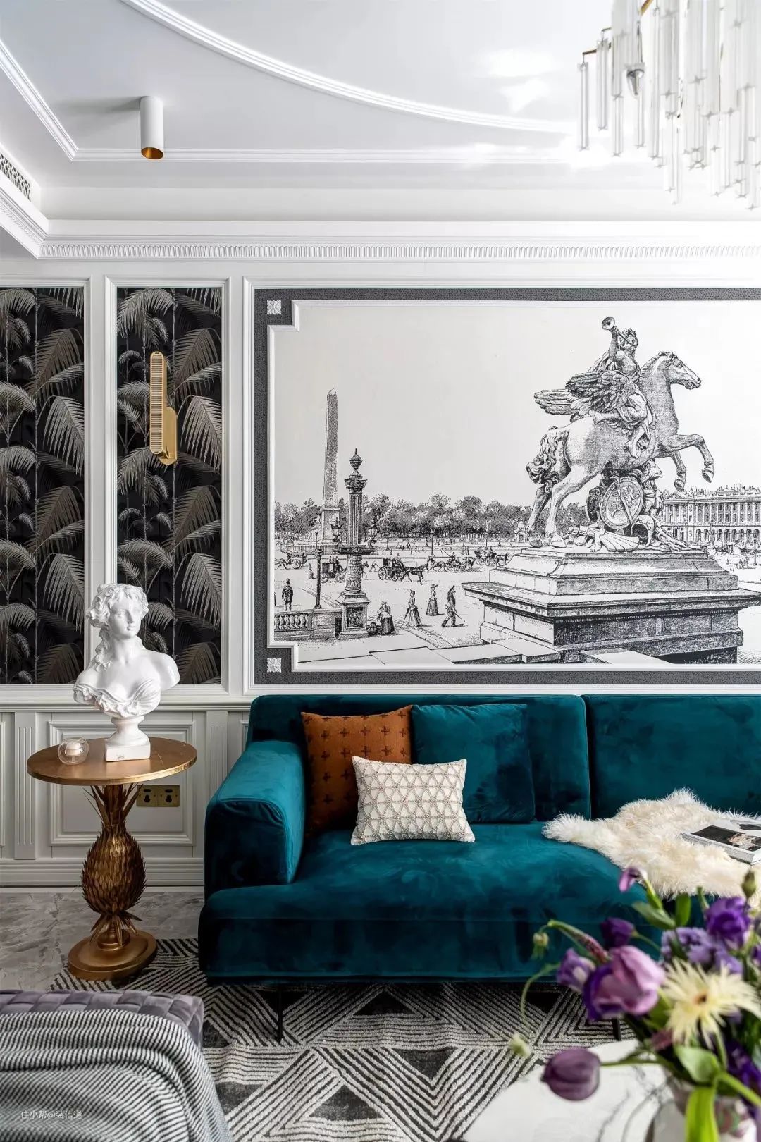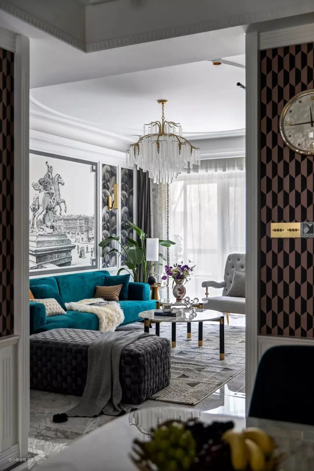客厅延续了古典轻奢复古风,让人轻瞥一眼就足以印象深刻,背景墙线条分隔造型,壁画与壁纸的组合,营造出复古庄重与空间细腻质感。