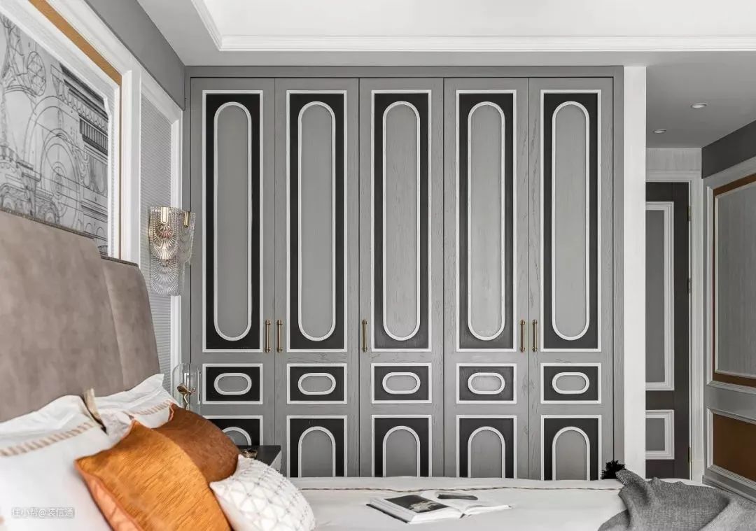 主卧衣柜柜门与房门设计分割异曲同工,柜门配色以重色为主,白色框线点缀,融合圆弧元素设计其中,精致之间彰显沉稳气质。