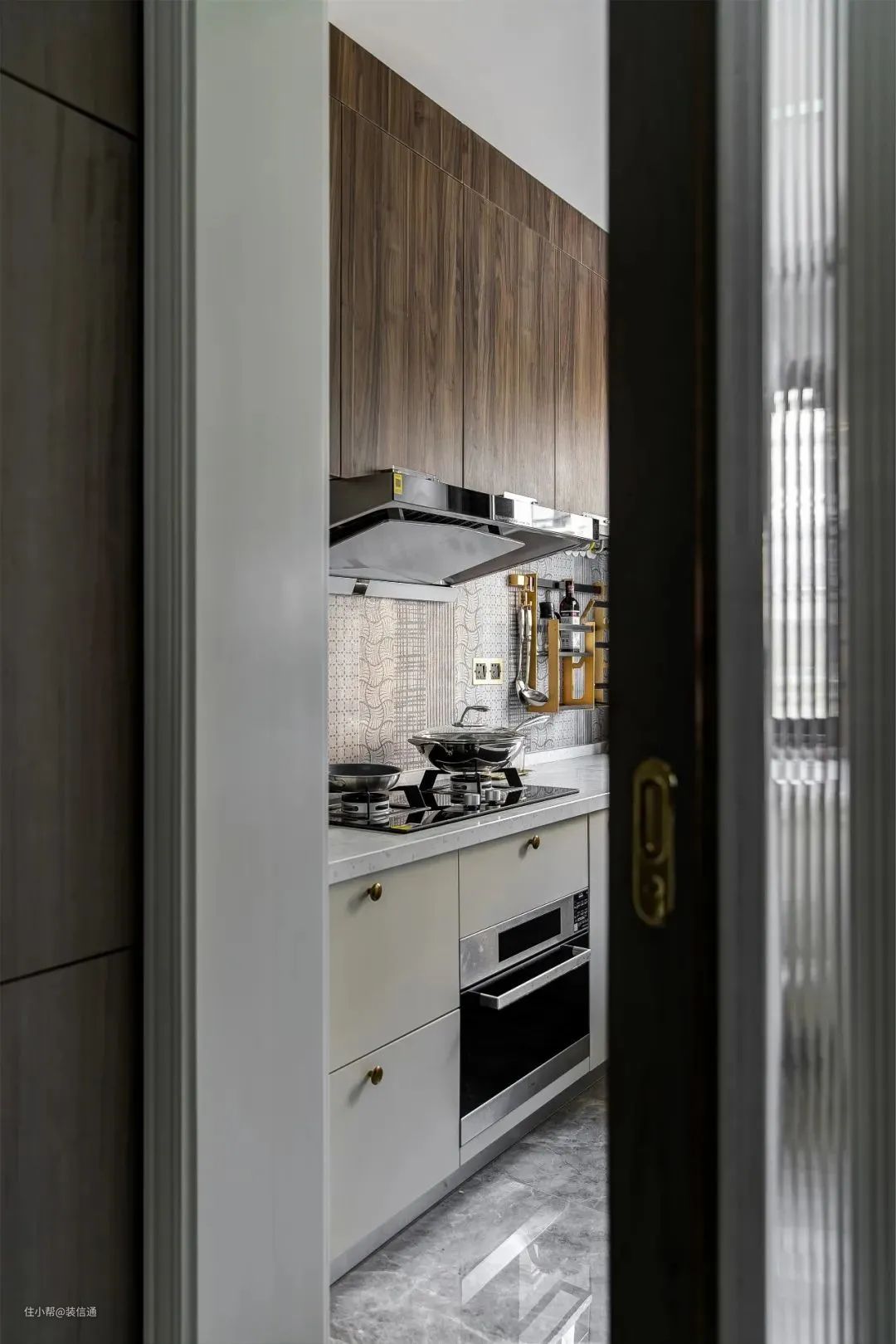 餐厅长虹玻璃背后是厨房,吊柜深胡桃木平板门,配亚克力把手,下柜是奶白色烤漆门板,金色把手点缀。