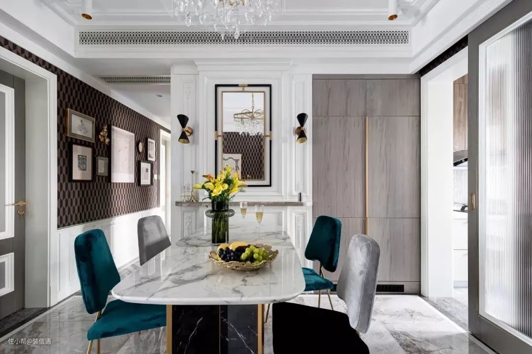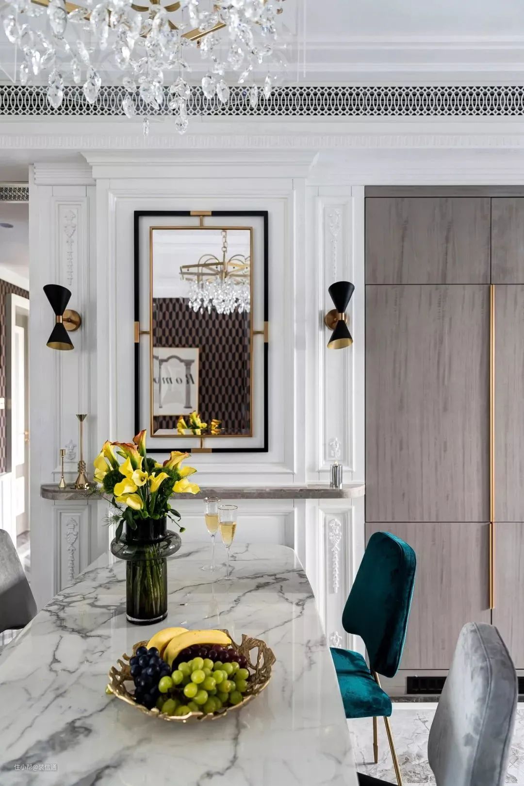 在主背景上,运用帽头,上下护墙分割,雕花,对称黑金壁灯,金色框装饰镜这些元素揉搓融合,再结合水晶吊灯,石膏美式线条等,一系列经典美式元素,互相搭配,框出餐厅唯美动人的轻奢风采。