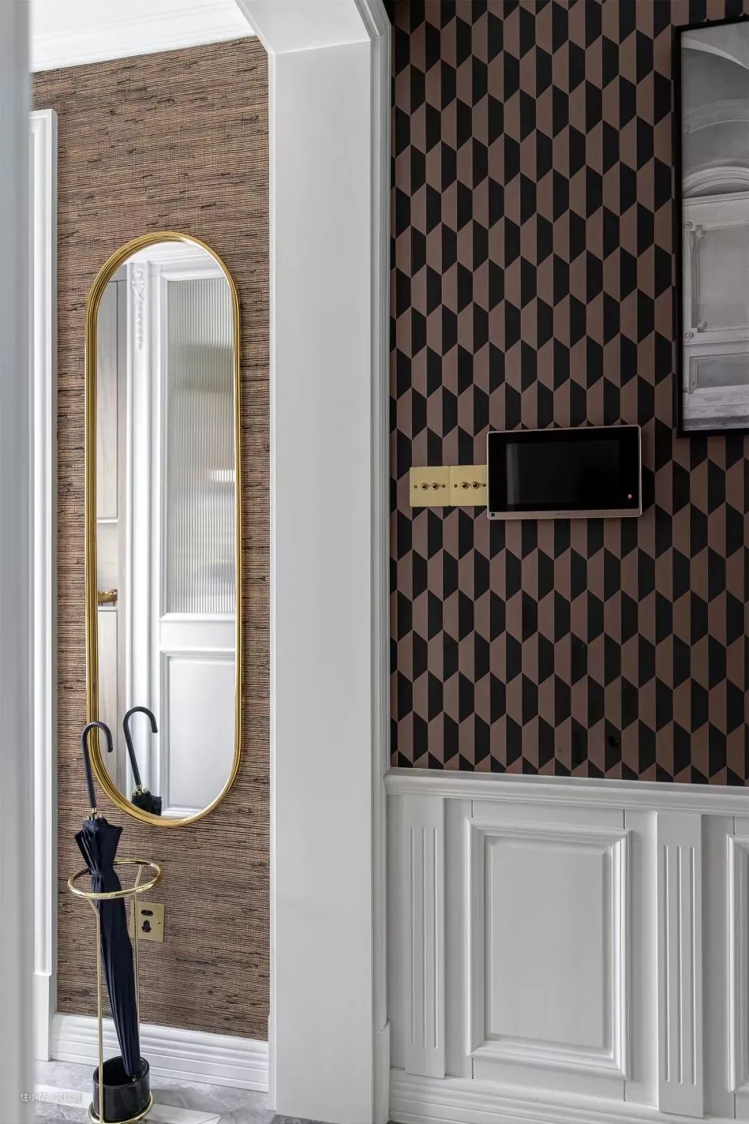 金边全身镜,金属质感精致的伞架,及复古造型的顶灯,门厅满是浓郁的仪式感和庄重感。