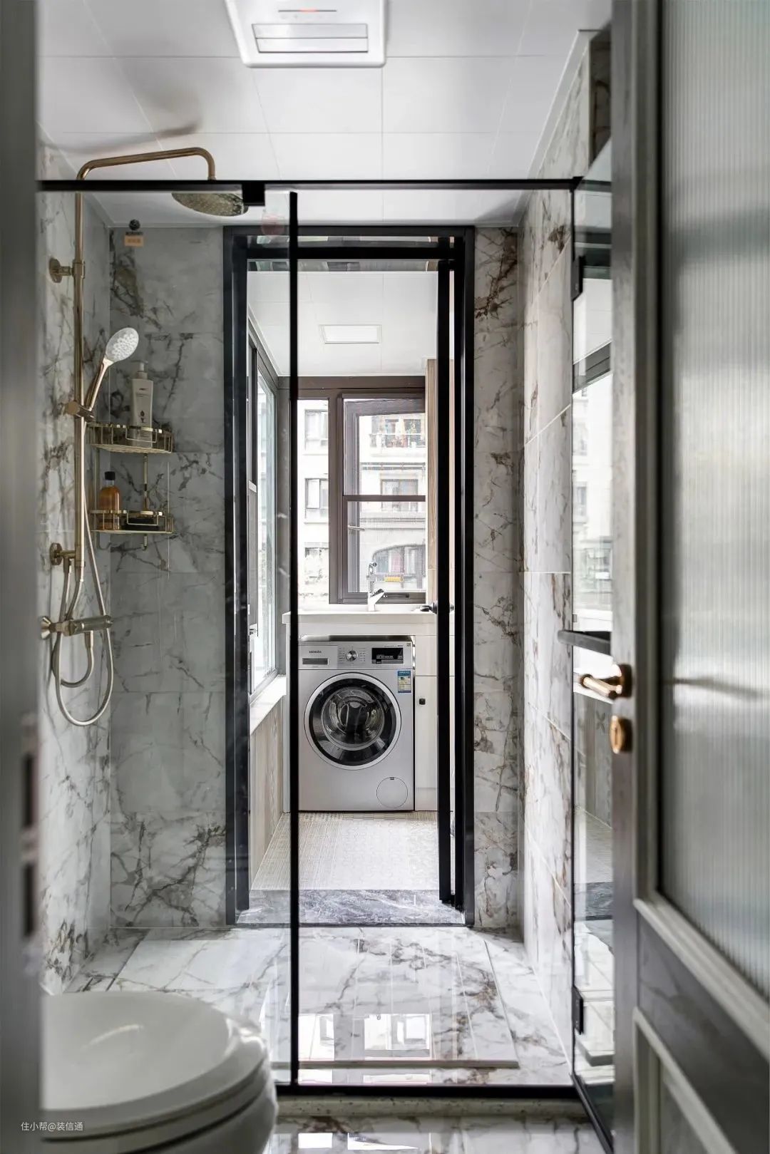 次卫湿区,选配了一种纹理夸张艺术的砖整铺。细黑框的长虹玻璃门外面就是加出来的洗衣房
