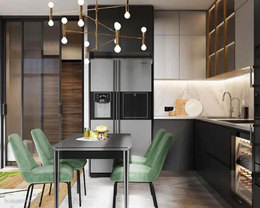 有西厨空间的,不妨将冰箱放西厨,将独立冰箱嵌入到柜体中,要注意,先选冰箱、再选橱柜。西厨一般有用餐、休闲的功能,冰箱放这里也非常方便,是个不错的选择。