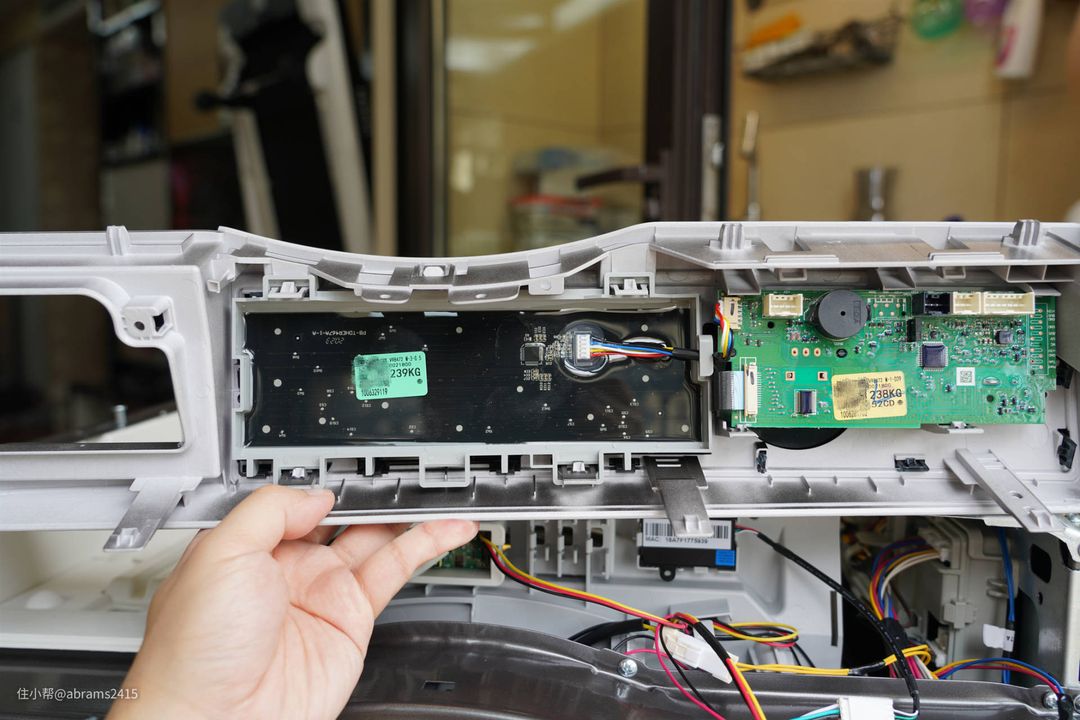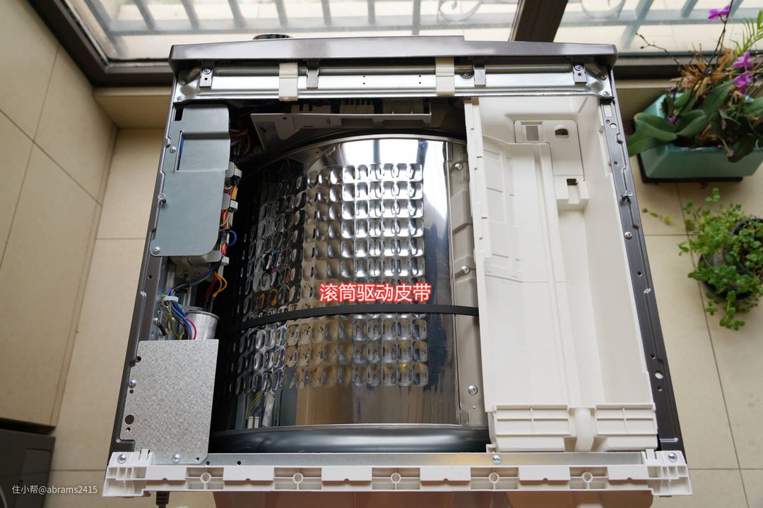 ▲这款海尔10kg热泵干衣机宽595mm,滚筒直径就达到560mm。也就是滚筒几乎和机身宽度持平。采用底部驱动电机直接通过驱动皮带来带动滚筒旋转。