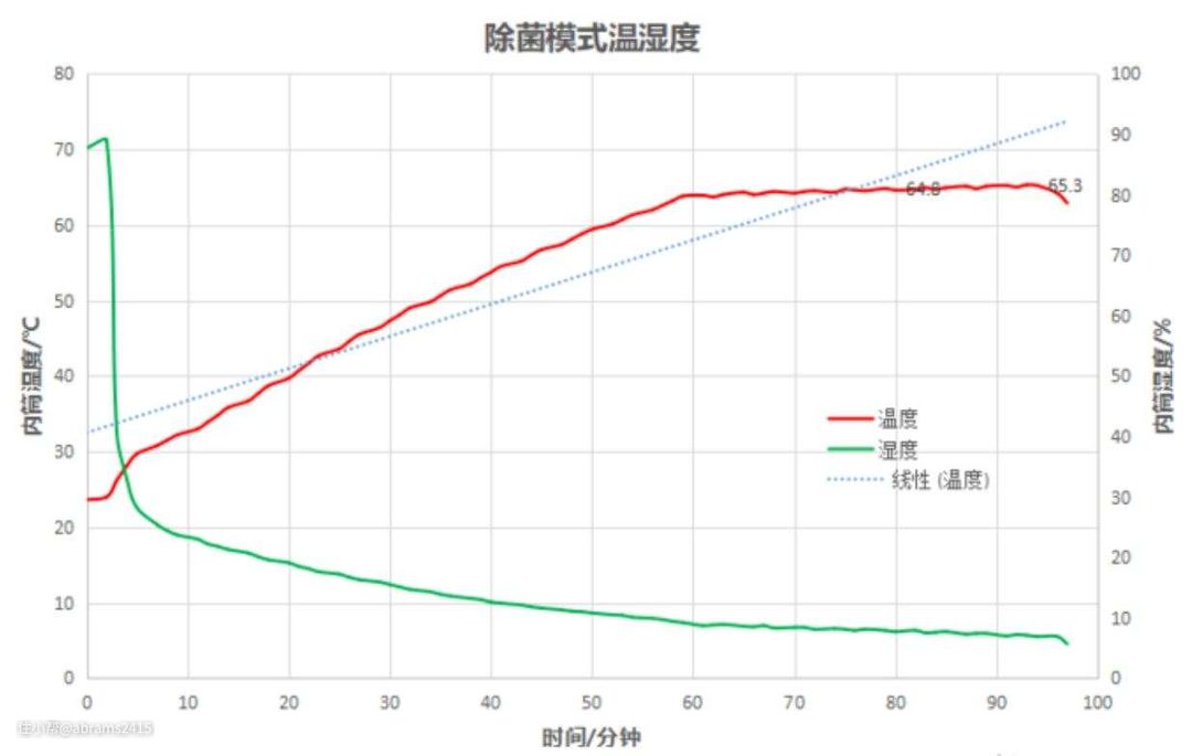 1、初始内筒温度基本相同,在26℃左右。 绿线海尔双擎热泵前期有PTC加热器辅助,内筒在4分钟内就快速升温到39.5℃。而红线普通热泵干衣机初期升温缓慢,用了21分钟才升温到37.2℃。显然海尔双擎热泵干衣机效率更高。