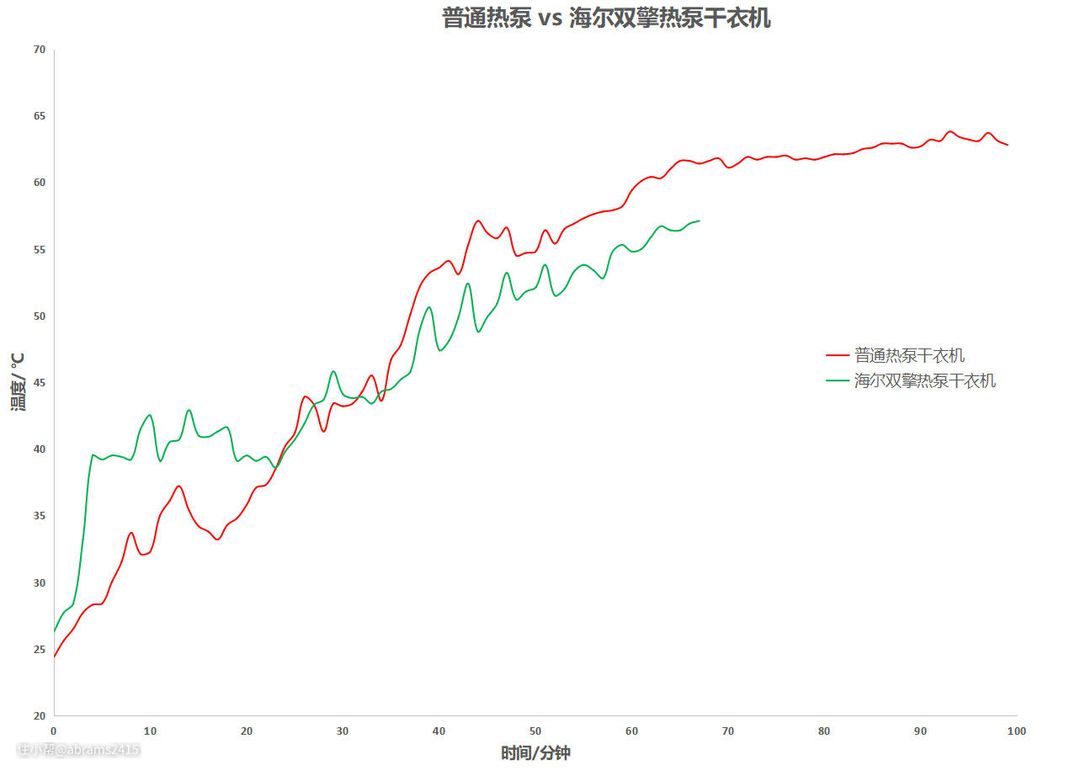 ▲我们来看看原始数据经数据处理后的内筒温升曲线,红线为普通热泵,绿线为海尔双擎: