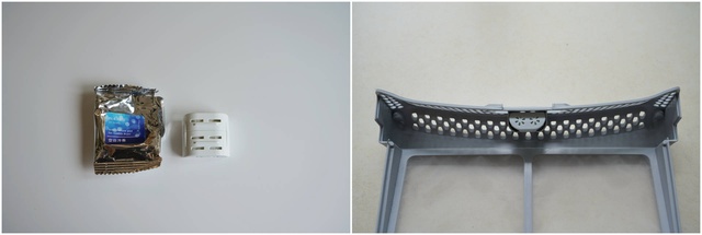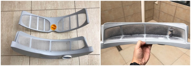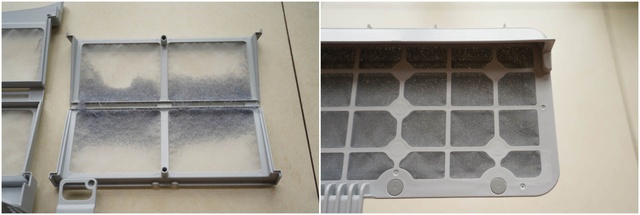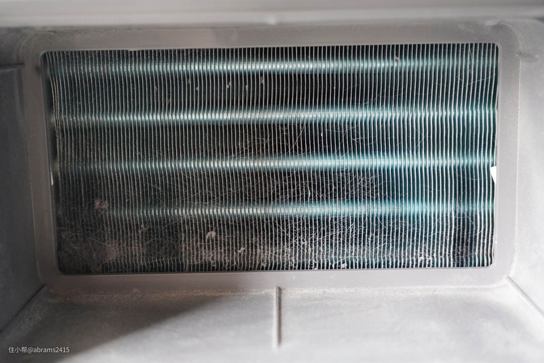 ▲这是用了1年的两层线屑过滤器后的冷凝器外侧,上面布满猫毛和灰尘。冷凝器和蒸发器内藏污纳垢,非常容易造成衣物二次污染。