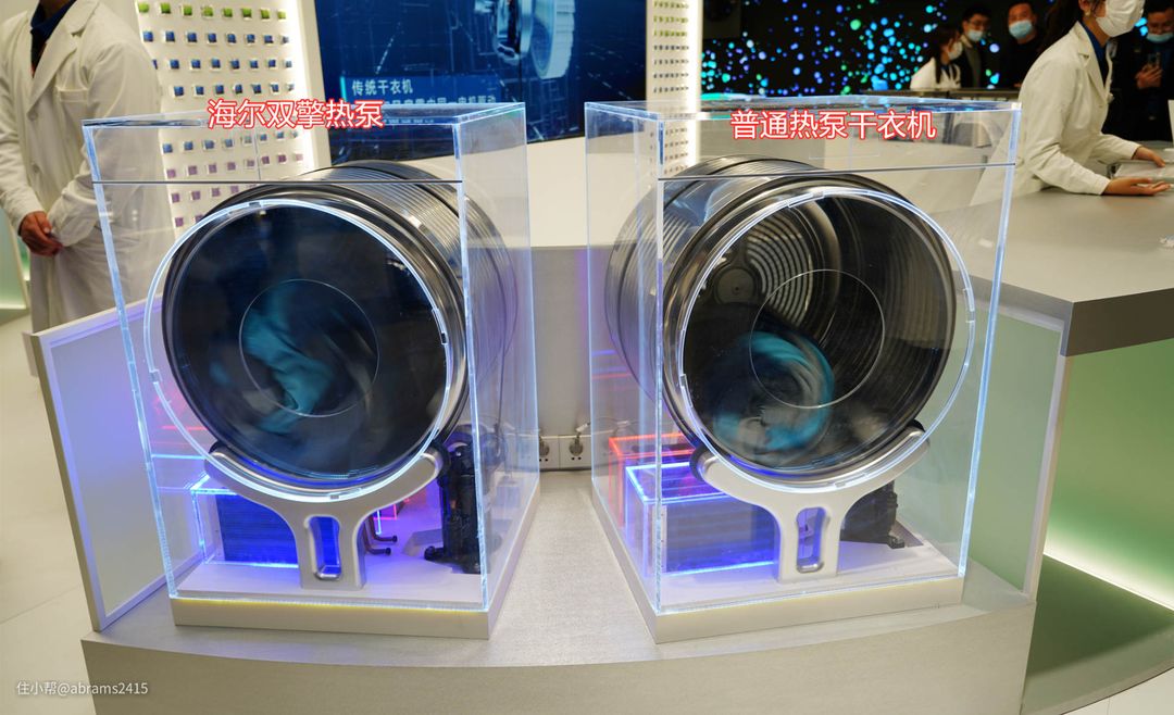 ▲现场演示了海尔双擎热泵干衣机 vs 传统热泵干衣机的防缠绕。这里能看到右侧普通热泵干衣机内的床品明显缩小并滚成了一个球、而左边海尔干衣机内的床品始终保持蓬松状态。