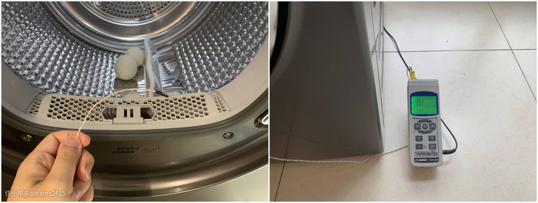 一床被套、一条空调被、三个枕套,分两次测试。洗衣机1400rpm脱水后开“大件”模式直到烘干自动判停。记录两台热泵干衣机筒内温度变化。