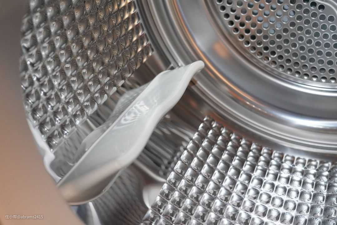 ▲滚筒内部密密麻麻凸起是为了提高织物间的空气流动,减少褶皱、提升烘干效果。两块提升筋呈波浪型,防止衣物缠绕、并尽可能高的提升衣物来增加空气流量。